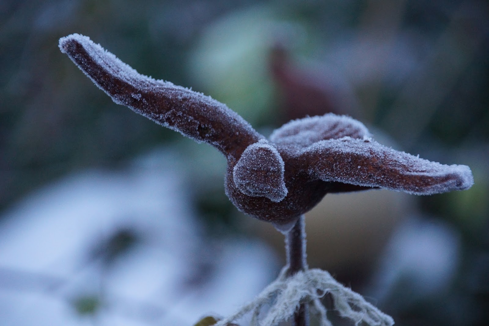 Frosten utnytter hver lille detalj til å "pynte" hagen til advent. Selv små insekthull blir sirlig besatt av glitter og krystaller.